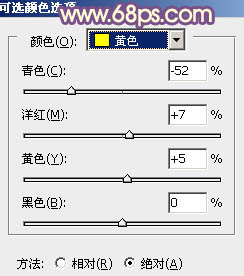 2、创建可选颜色调整图层,对黄、绿、黑进行调整,参数设置如图4 - 6,效果如图7。这一步给图片增加橙黄色。