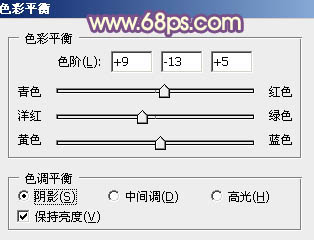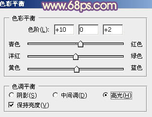 10、创建色彩平衡调整图层,对阴影,高光进行调整,参数设置如图27,28,确定后用黑色画笔把人物部分擦出来,效果如图29。
