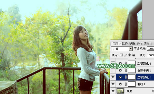 素材图片整体颜色以黄绿色为主,转为青绿色也很快。可以把图片中的绿色转为青绿色,黄绿色转为橙黄色,再在高光区域渲染一些淡青色即可。