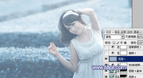 5、新建一个图层填充蓝色:#97B4D2,混合模式改为“滤色”,不透明度改为:60%,效果如下图。这一步适当增加图片亮度。