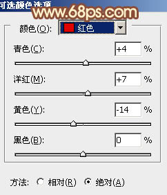 8、创建可选颜色调整图层,对红,黄进行调整,参数设置如图23,24,效果如图25。这一步适当增加图片暖色亮度。