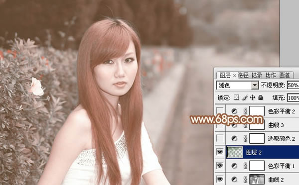 7、按Ctrl + Alt + 2 调出高光选区,按Ctrl + Shift + I 反选,新建一个图层填充暗绿色:#688961,混合模式改为“滤色”,不透明度改为:50%,效果如下图。这一步给图片的暗部增加暗绿色。