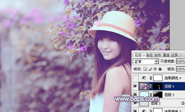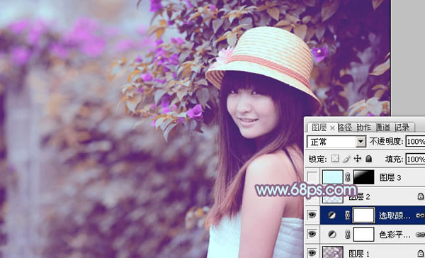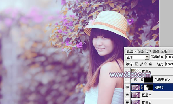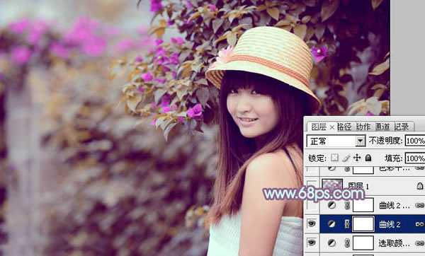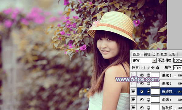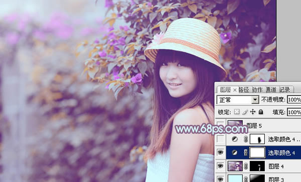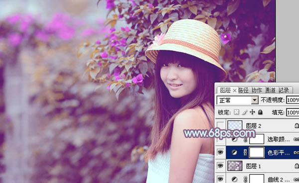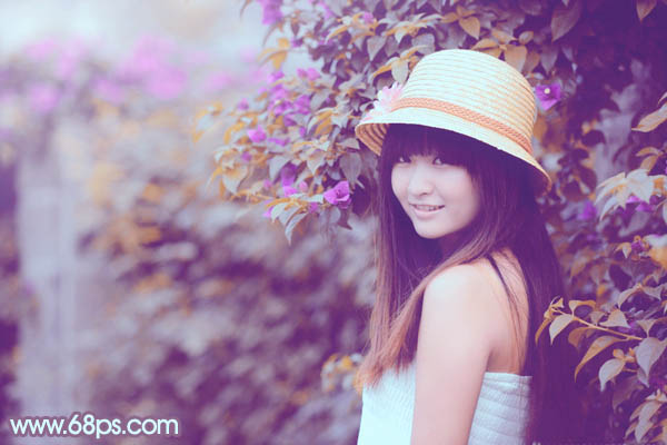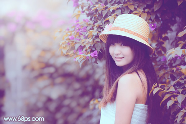 素材图片基本以绿色为主。转紫色的时候只需要把绿色及暗部的颜色转为暗紫色,高光部分的颜色转为橙黄色,再美化一下人物,渲染一些高光等即可。