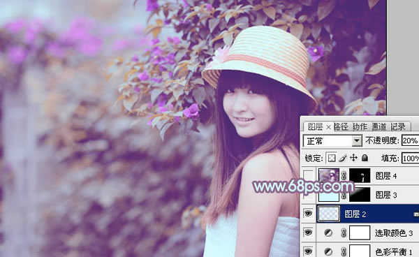 6、按Ctrl + Alt + 2 调出高光选区,按Ctrl + Shift + I 反选,新建一个图层填充暗紫色:#754679,混合模式改为“滤色”,不透明度改为:50%,效果如下图。这一步给暗部增加紫色和亮度。