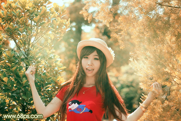 素材图片以黄绿色为主,转为暖色并不复杂。只需要把树叶部分的黄绿色转为橙红色,绿色及暗部的颜色不变,后期再微调一下高光及暗部颜色即可。
