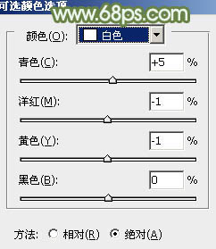 7、创建可选颜色调整图层,对黄、绿、白进行调整,参数设置如图17 - 19,效果如图20。这一步主要把图片中的绿色调淡。