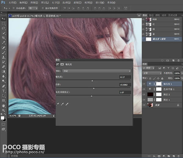 6、降低曝光度,为人物增添些许朦胧感。