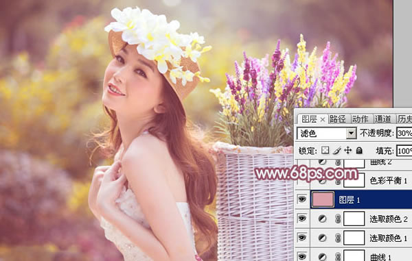 4、新建一个图层,填充淡红色:#DBA0A9,混合模式改为“滤色”,不透明度改为:30%,效果如下图。这一步把图片颜色转淡。
