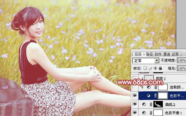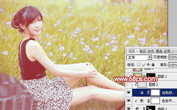 素材图片主色以草地暗绿色为主,颜色不够时尚。调色的时候可以适当把绿色转为橙黄色并调淡,再把图片暗部调亮,局部渲染一点高光,这样整体就会柔和很多,人物也会更甜美。
