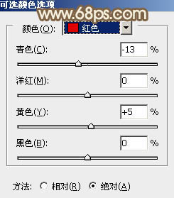 5、创建可选颜色调整图层,对红、黄、绿进行调整,参数设置如图11 - 13,效果如图14。这一步主要把图片中的橙黄色转为橙红色。