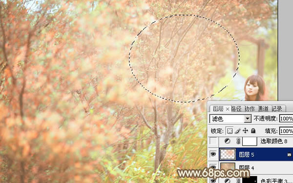 15、新建一个图层,用椭圆选框工具拉出下图所示的选区,羽化60个像素后填充橙红色:#ECA471,混合模式改为“滤色”,效果如下图。这一步给图片局部增加高光。