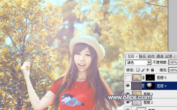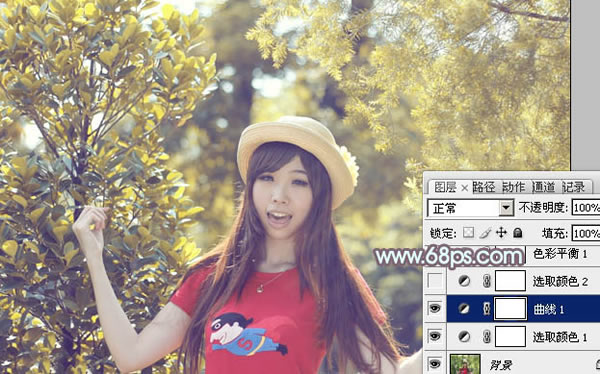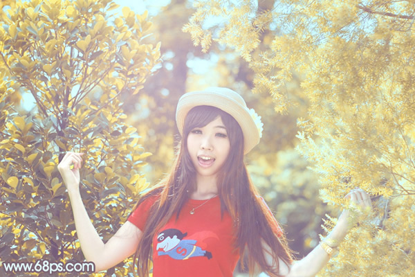 素材图片以黄绿色为主,转为橙黄色是非常快的。把图片中的绿色转为橙黄色,高光部分增加一点淡黄色,再把整体调柔和,暗部增加一点蓝色即可。