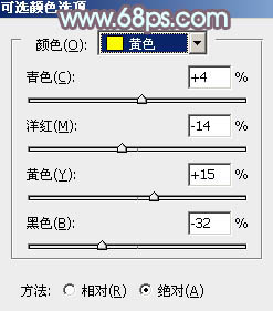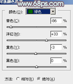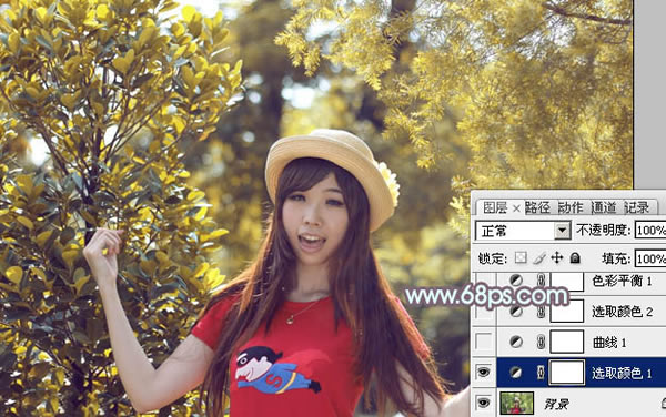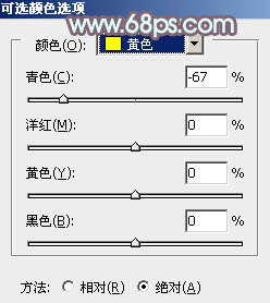 1、打开素材图片,创建可选颜色调整图层,对黄,绿进行调整,参数及效果如下图。这一步把图片主色转为橙黄色。