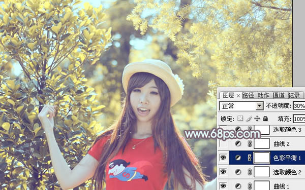 4、创建色彩平衡调整图层,对阴影,高光进行调整,参数设置如图14,15,确定后把图层不透明度改为:30%,效果如图16。这一步微调图片暗部及高光部分的颜色。