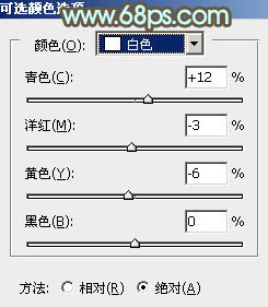 5、创建可选颜色调整图层,对黄、绿、青、白、中性色进行调整,参数设置如图9 - 13,效果如图14。这一步微调图片主色,并给高光部分增加淡青色。