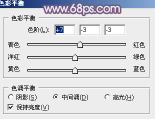 8、创建色彩平衡调整图层,对阴影、中间调、高光进行调整,参数设置如图15 - 17,效果如图18。这一步给图片增加暖色。