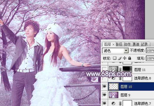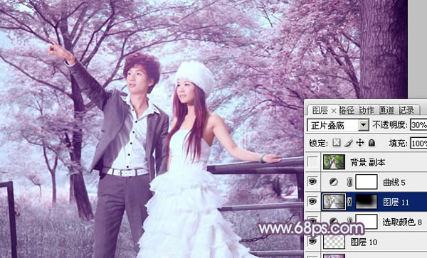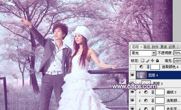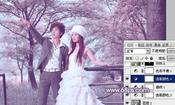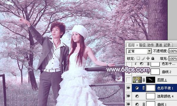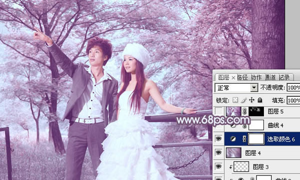 蓝紫色是比较浪漫的色调,用通道替换调色是非常快的,替换后得到初步的双色图片,稍微调色即可转为所需的蓝紫色,后期微调人物及局部颜色即可。