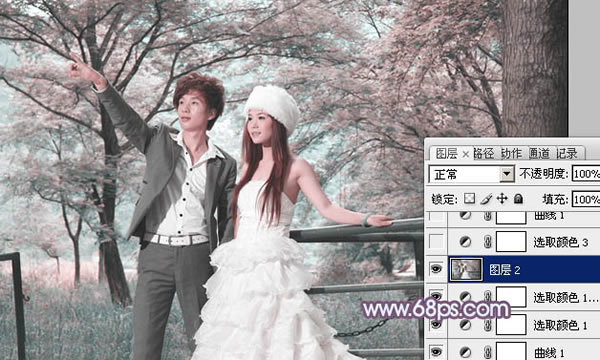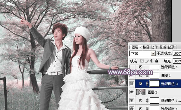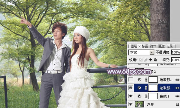 10、用曲线、色彩平衡,可选颜色等调整一下人物肤色,数值自定,大致跟背景融合即可。