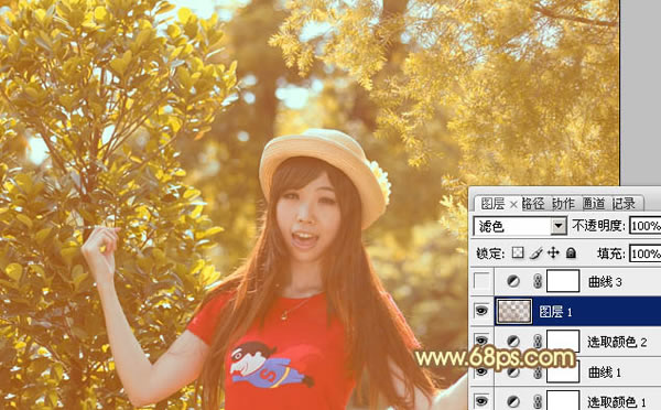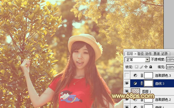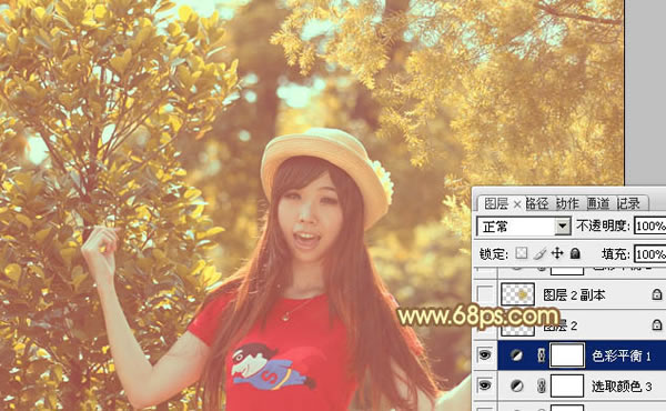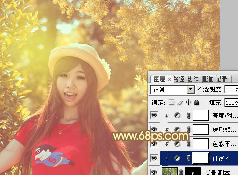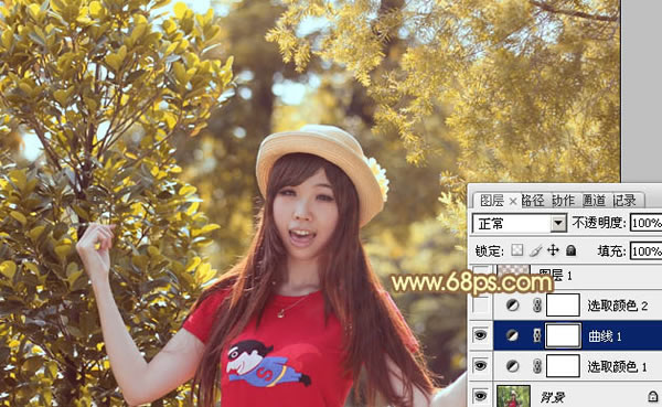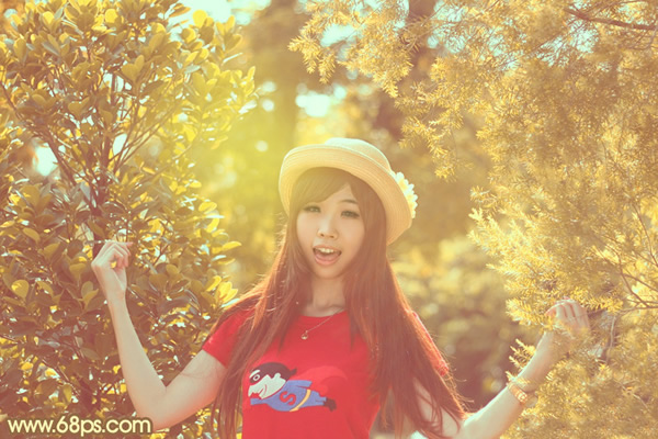 素材图片颜色比较单一,转为红褐色是比较快的,只需要把绿色转为橙黄色,暗部颜色转为红褐色并适当调亮,再把整体调柔和即可。