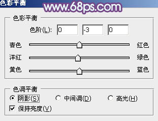 8、创建色彩平衡调整图层,对阴影、中间调、高光进行微调,参数及效果如下图。