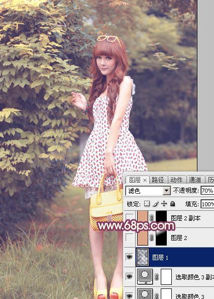 1、打开素材图片,创建可选颜色调整图层,对黄,绿进行调整,参数设置如图1,2,效果如图3。这一步给图片增加橙黄色。