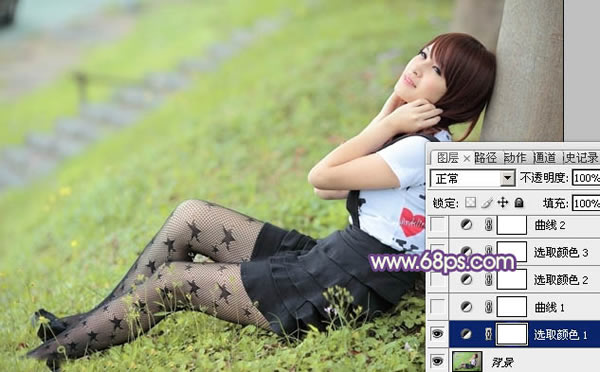 素材图片以绿色为主,转为淡黄色是非常快的,直接用调色工具把绿色转为黄绿色,然后调淡就可以,暗部可根据需要渲染一点蓝色。