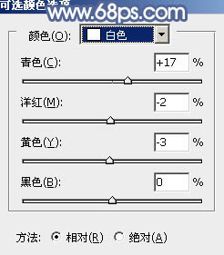 9、创建可选颜色调整图层,对红、黄、白进行调整,参数设置如图30 - 32,效果如图33。这一步微调图片中的暖色及高光部分的颜色。