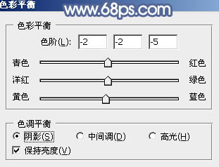 4、创建色彩平衡调整图层,对阴影,高光进行调整,参数设置如图10,11,效果如图12。这一步给图片高光部分增加淡蓝色,暗部增加蓝色。