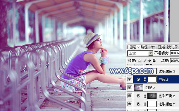 素材图片主色比较中性,调色的时候可以把图片中的绿色转为淡青色,暗部及其他部分的颜色直接用曲线等转为蓝色即可。