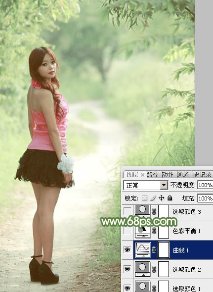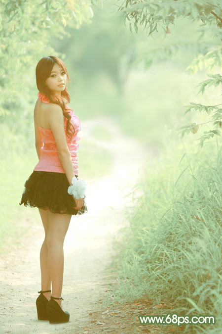 素材图片以黄色及暗绿色为主,我们需要的是淡绿色,调色的时候可以把暗绿色调亮调淡,黄色转为较淡的黄绿色,再把人物部分调红润即可。