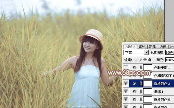 2、创建可选颜色调整图层,对黄,绿进行调整,参数设置如图5,6,效果如图7。这一步同样给背景部分增加黄褐色。