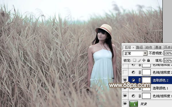 2、创建可选颜色调整图层,对黄、白、中性色进行调整,参数设置如图3 - 5,效果如图6。这一步减少图片中的黄色,增加褐色。