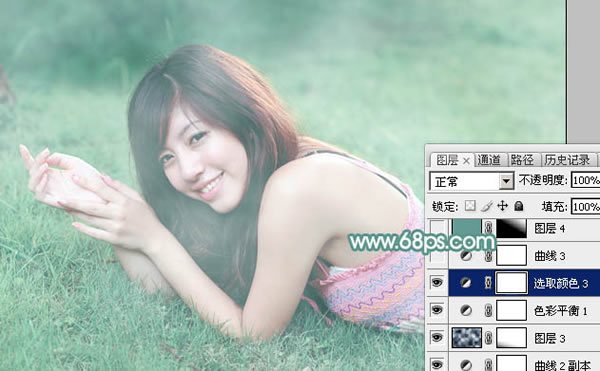 素材图片以黄绿色为主,跟青绿色比较接近。调色的时候先把黄色转为绿色,然后把绿色转为青绿色,暗部增加一点蓝色,再把整体调淡调柔和即可。