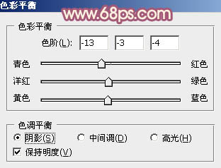 5、按Ctrl + Alt + 2调出高光选区,按Ctrl + Shift + I 反选得到暗部选区,然后创建色彩平衡调整图层,对阴影进行调整,参数及效果如下图。这一步微调暗部颜色。