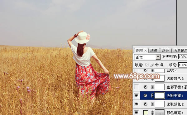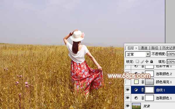 素材图片地面与天空的颜色比较分明,调色的时候可以把地面与天空分开调色,地面部分转为柔和的暖色,天空部分转为清爽的淡蓝色即可。