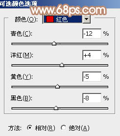 4、创建可选颜色调整图层,对红、黄、白、中性色进行调整,参数设置如图8 - 11,效果如图12。这一步给图片增加橙红色。