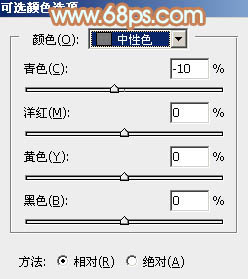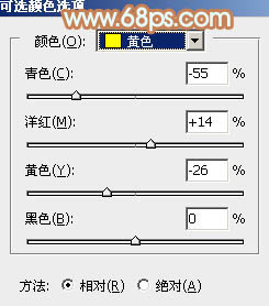 2、创建可选颜色调整图层,对黄、绿、中性色进行调整,参数设置如图2 - 4,效果如图5。这一步把背景部分的绿色转为橙黄色。