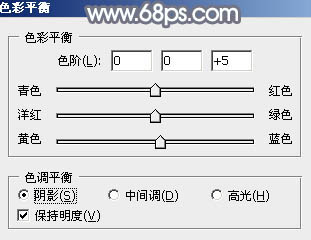 14、按Ctrl + Alt + 2 调出高光选区,按Ctrl + Shift + I 反选,然后创建色彩平衡调整图层,对阴影、中间调,高光进行调整,参数及效果如下图。这一步给图片暗部增加蓝色。