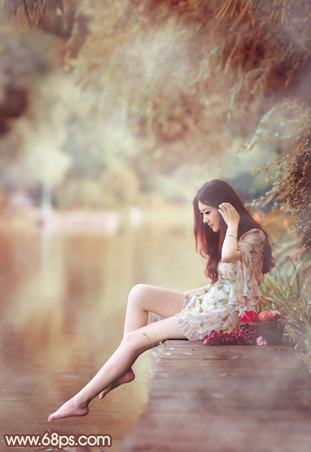 素材图片主色为绿色,处理的时候直接把绿色转为暖色,然后把主色稍微调淡,暗部多增加一点红褐色,再稍微美化一下人物即可。