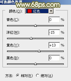 12、创建可选颜色调整图层,对红、黄、白,黑进行调整,参数设置如图25 - 28,效果如图29。这一步给图片增加黄褐色。