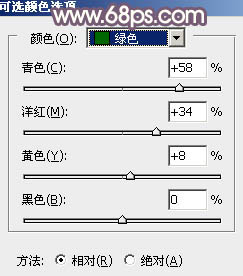 1、打开素材图片,创建可选颜色调整图层,对绿色进行调整,参数及效果如下图。这一步把图片中的绿色稍微调深一点。
