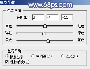 10、创建色彩平衡调整图层,对阴影,高光进行调整,参数及效果如下图。这一步给暗部及高光部分增加蓝色。
