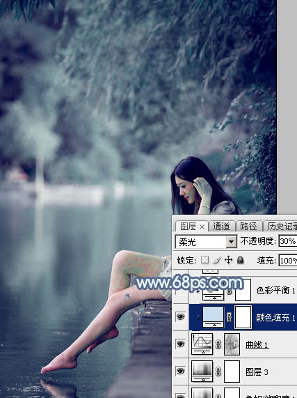 4、创建纯色调整图层,颜色设置为淡蓝色:#C9DEEF,确定后把混合模式改为“柔光”,不透明度改为:30%,再按Ctrl + Alt + G 创建剪切蒙版,效果如下图。这一步给暗部增加淡蓝色。