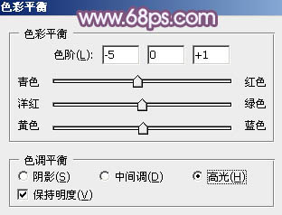 11、创建色彩平衡调整图层,对高光进行调整,参数设置如图28,确定后同上的方法创建剪切蒙版,效果如图29。