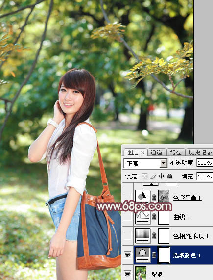 1、打开素材图片,创建可选颜色调整图层,对黄色,绿色进行调整,参数及效果如下图。这一步给图片增加黄褐色。