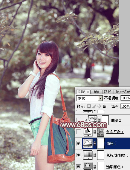 素材图片主色为黄绿色,调色的时候降低主色饱和度得到初步的中性色,然后用曲线等给暗部增加红褐色,高光部分增加淡绿色即可。