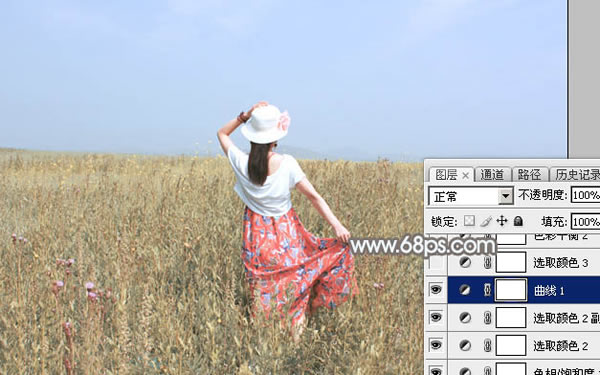 素材图片有点暗,整体不够清爽。调色的时候先把草地部分的颜色调统一,并转为淡黄色;天空部分增加一点淡蓝色;然后把整体调淡一点即可。