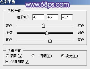 5、创建色彩平衡调整图层,对阴影,高光进行调整,参数及效果如下图。这一步主要给高光部分增加青蓝色。