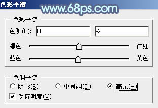 9、创建色彩平衡调整图层,对高光进行调整,参数及效果如下图。