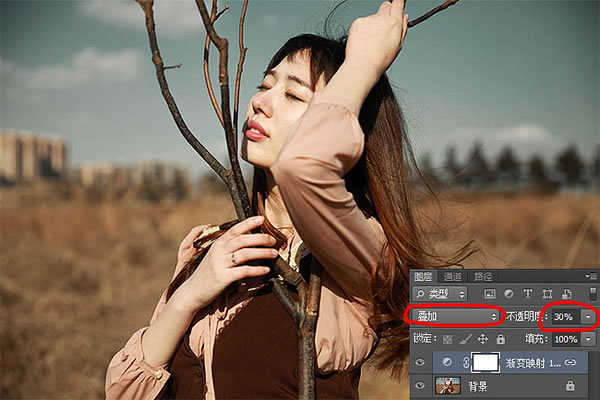 1、打开素材图片渐变映射调整图层,参数如下 选用较暖的明暗色作为叠加层,确定后把混合模式改为“叠加”,不透明度改为:30%,如下图。